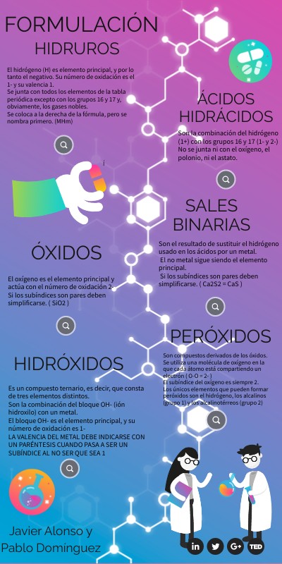 El hidrógeno (H) es elemento principal, y por lo tanto el negativo. Su número de oxidación es el 1- y su valencia 1. Se junta con todos los elementos de la tabla periódica excepto con los grupos 16 y 17 y, obviamente, los gases nobles. Se coloca a la derecha de la fórmula, pero se nombra primero. (MHm)