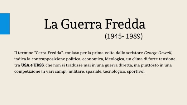 Il termine "Gerra Fredda", coniato per la prima volta dallo scrittore George Orwell, indica la contrapposizione politica, economica, ideologica, un clima di forte tensione tra USA e URSS, che non si tradusse mai in una guerra diretta, ma piuttosto in una competizione in vari campi (militare, spaziale, tecnologico, sportivo).
