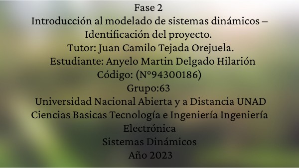 Fase 2 Introducción al modelado de sistemas dinámicos – Identificación del proyecto. Tutor: Juan Camilo Tejada Orejuela. Estudiante: Anyelo Martin Delgado Hilarión Código: (N°94300186) Grupo:63 Universidad Nacional Abierta y a Distancia UNAD Ciencias Basicas Tecnología e Ingeniería Ingeniería Electrónica Sistemas Dinámicos Año 2023