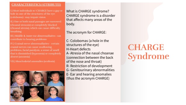 Educational needs of children with charge syndrome. (n.d.). Retrieved March 4, 2023, from https://www.chargesyndrome.org/wp-content/uploads/2016/03/11-Educational-needs.pdf Home. Cincinnati Childrens. (n.d.). Retrieved March 3, 2023, from https://www.cincinnatichildrens.org/health/c/charge-syndrome Muscles and bones - the charge syndrome foundation. (n.d.). Retrieved March 3, 2023, from https://www.chargesyndrome.org/wp-content/uploads/2016/05/Muscles-and-Bones.pdf U.S. National Library of Medicine. (n.d.). Charge syndrome: Medlineplus genetics. MedlinePlus. Retrieved March 3, 2023, from https://medlineplus.gov/genetics/condition/charge-syndrome/#:~:text=CHARGE%20syndrome%20is%20a%20disorder,genital%20abnormalities%2C%20and%20ear%20abnormalities.