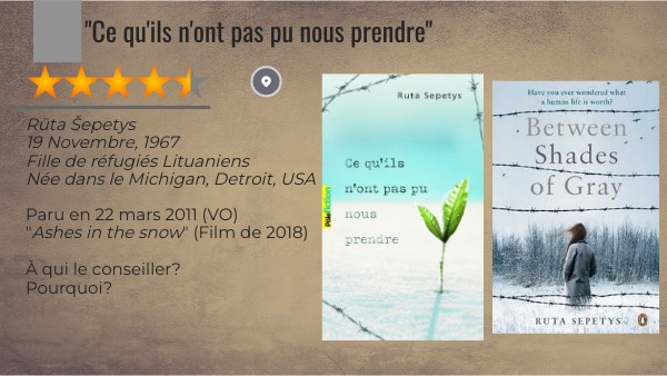 Paru en 22 mars 2011 (VO) "Ashes in the snow" (Film de 2018) À qui le conseiller? Pourquoi?