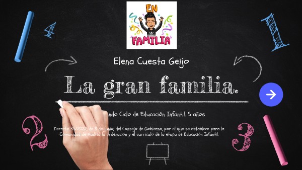 La situación de aprendizaje La gran familia, está orientada a la adquisición de aprendizajes sobre la repercusión del excesivo uso de pantallas en la vida cotidiana. Se pretende transmitir al alumnado conocimientos, destrezas, actitudes y valores para que actúen de una manera responsable ante este tipo de ocio. Investigando y dando a conocer a demás, a través de un programa de radio, alternativas motivadoras y enriquecedoras en todos los ámbitos, acabarán creando sus propios juegos y animando a sus propias familias a crear una Asociación en el barrio para jugar en familia.