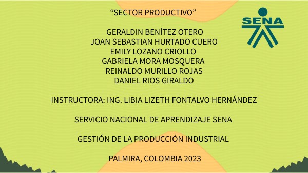 “SECTOR PRODUCTIVO” GERALDIN BENÍTEZ OTEROJOAN SEBASTIAN HURTADO CUEROEMILY LOZANO CRIOLLO GABRIELA MORA MOSQUERA REINALDO MURILLO ROJASDANIEL RIOS GIRALDO INSTRUCTORA: ING. LIBIA LIZETH FONTALVO HERNÁNDEZ SERVICIO NACIONAL DE APRENDIZAJE SENA GESTIÓN DE LA PRODUCCIÓN INDUSTRIAL PALMIRA, COLOMBIA 2023