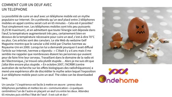 La possibilité de cuire un œuf avec un téléphone mobile est un mythe populaire sur Internet. On a prétendu qu’un œuf placé entre 2 téléphones mobiles en appel continu serait cuit en 65 minutes – Cela est-il possible? Tout simplement non. Les téléphones mobiles sont très peu puissants (0,25 W maximum), et en admettant que toute l’énergie soit déposée dans l’œuf, la température augmenterait très peu, certainement bien en dessous de la température nécessaire pour cuire un œuf, c’est-à-dire 70°C ou plus. Ces articles sont des canulars. Le site Web du webzine Gelf Magazine montre que le canular a été initié par Charles Ivermee au Royaume-Uni en 2000. Lorsqu’on lui a demandé pourquoi il avait diffusé l’article sur Internet, Ivermee a répondu : « C’était il y a 6 ans mais il me semble me rappeler que nombreuses étaient les personnes qui avaient peur de faire frire leur cerveau. Travaillant dans le domaine de la radio et de l’électronique, j’ai trouvé cela plutôt stupide… Alors je me suis dit que j’allai être encore plus stupide. » En octobre 2007, l’ACRBR (centre australien de recherche sur les effets biologiques des radiofréquences) a mené une expérience afin de discréditer le mythe selon lequel l’exposition à un téléphone mobile peut cuire un œuf. The video can be downloaded here.