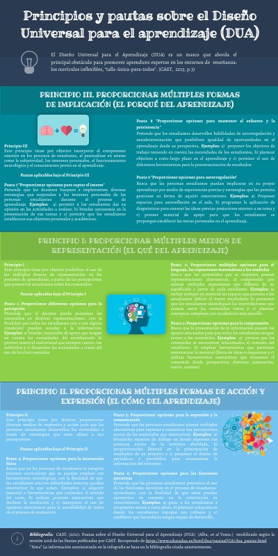 Bibliografía: CAST. (2011). Pautas sobre el Diseño Universal para el Aprendizaje (DUA) (Alba, et al Trans.) modificado según la versión 2018 de las Pautas publicadas por CAST. Recuperado de https://www.educadua.es/html/dua/pautasDUA/dua_pautas.html*Nota* La información suministrada en la infografía se basa en la bibliografía citada anteriormente.