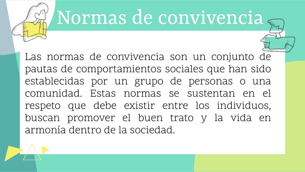 Las normas de convivencia son un conjunto de pautas de comportamientos sociales que han sido establecidas por un grupo de personas o una comunidad. Estas normas se sustentan en el respeto que debe existir entre los individuos, buscan promover el buen trato y la vida en armonía dentro de la sociedad.