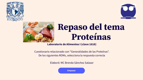 Laboratorio de Alimentos I (clave 1618) Cuestionario relacionado con "Generalidades de las Proteínas". De los siguientes ROMs, selecciona la respuesta correcta Elaboró: MC Brenda Sánchez Salazar