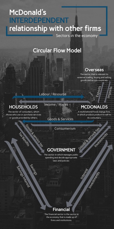 Shows how McDonald’s restaurant is interdependent with other firms in different sectors household, government, banks and overseas of the economy.