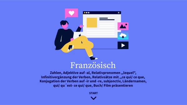 Zahlen, Adjektive auf -al, Relativpronomen ,,lequel", Infinitivergänzung der Verben, Relativsätze mit ,,ce qui/ ce que, Konjugation der Verben auf -ir und -re, subjonctiv, Ländernamen, qui/ qu´est- ce qui/ que, Buch/ Film präsentieren