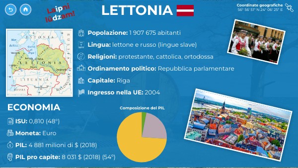 Popolazione: 1 907 675 abitanti Lingua: lettone e russo (lingue slave) Religioni: protestante, cattolica, ortodossa Ordinamento politico: Repubblica parlamentare Capitale: Riga Ingresso nella UE: 2004