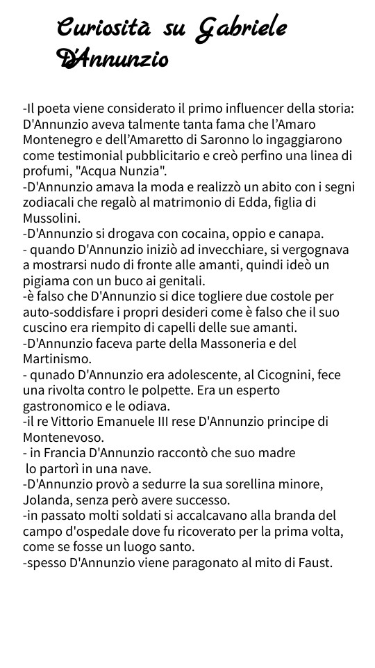 -Il poeta viene considerato il primo influencer della storia: D'Annunzio aveva talmente tanta fama che l’Amaro Montenegro e dell’Amaretto di Saronno lo ingaggiarono come testimonial pubblicitario e creò perfino una linea di profumi, "Acqua Nunzia".-D'Annunzio amava la moda e realizzò un abito con i segni zodiacali che regalò al matrimonio di Edda, figlia di Mussolini. -D'Annunzio si drogava con cocaina, oppio e canapa. - quando D'Annunzio iniziò ad invecchiare, si vergognava a mostrarsi nudo di fronte alle amanti, quindi ideò un pigiama con un buco ai genitali. -è falso che D'Annunzio si dice togliere due costole per auto-soddisfare i propri desideri come è falso che il suo cuscino era riempito di capelli delle sue amanti. -D'Annunzio faceva parte della Massoneria e del Martinismo. - qunado D'Annunzio era adolescente, al Cicognini, fece una rivolta contro le polpette. Era un esperto gastronomico e le odiava. -il re Vittorio Emanuele III rese D'Annunzio principe di Montenevoso. - in Francia D'Annunzio raccontò che suo madre lo partorì in una nave. -D'Annunzio provò a sedurre la sua sorellina minore, Jolanda, senza però avere successo. -in passato molti soldati si accalcavano alla branda del campo d'ospedale dove fu ricoverato per la prima volta, come se fosse un luogo santo. -spesso D'Annunzio viene paragonato al mito di Faust.