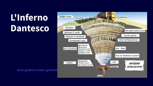 L'Inferno è una profonda cavità a forma di imbuto che si apre sotto Gerusalemme e raggiunge il centro della Terra. È composta da nove cerchi e, man mano che si scende, i cerchi si restringono; infatti minore è il numero dei peccatori puniti nei cerchi, che via via sono più lontani dalla superficie. I cerchi più grandi si trovano più in alto perché più diffuso è il peccato che in essi è punito e maggiore è il numero dei peccatori condannati. Più si scende, più si è lontani da Dio e maggiore è la gravità del peccato punito.