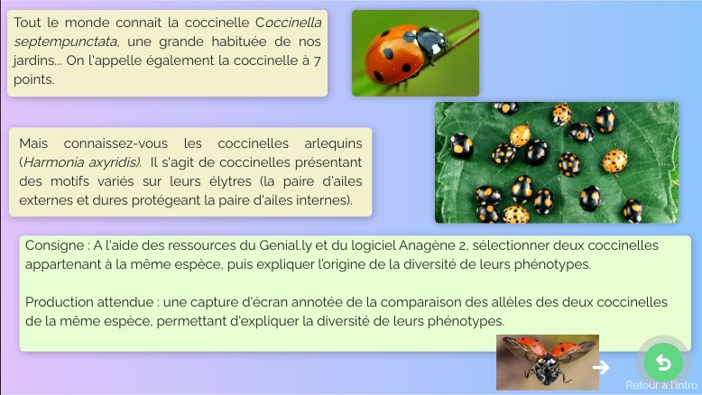 Consigne : A l'aide des ressources du Genial.ly et du logiciel Anagène 2, sélectionner deux coccinelles appartenant à la même espèce, puis expliquer l’origine de la diversité de leurs phénotypes.Production attendue : une capture d'écran annotée de la comparaison des allèles des deux coccinelles de la même espèce, permettant d'expliquer la diversité de leurs phénotypes.