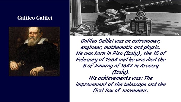 Galileo Galilei was an astronomer, engineer, mathematic and physic. He was born in Pisa (Italy) , the 15 of February of 1564 and he was died the 8 of Januray of 1642 in Arcetry (Italy). His achievements was: The improvement of the telescope and the first law of movement.