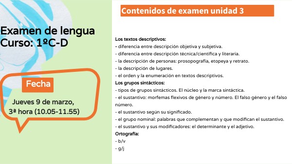 Los textos descriptivos: - diferencia entre descripción objetiva y subjetiva. - diferencia entre descripción técnica/científica y literaria. - la descripción de personas: prosopografía, etopeya y retrato. - la descripción de lugares. - el orden y la enumeración en textos descriptivos. Los grupos sintácticos: - tipos de grupos sintácticos. El núcleo y la marca sintáctica. - el sustantivo: morfemas flexivos de género y número. El falso género y el falso número. - el sustantivo según su significado. - el grupo nominal: palabras que complementan y que modifican el sustantivo. - el sustantivo y sus modificadores: el determinante y el adjetivo. Ortografía: - b/v - g/j