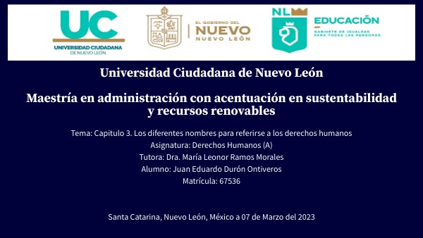 Tema: Capitulo 3. Los diferentes nombres para referirse a los derechos humanos Asignatura: Derechos Humanos (A) Tutora: Dra. María Leonor Ramos Morales Alumno: Juan Eduardo Durón Ontiveros Matrícula: 67536 Santa Catarina, Nuevo León, México a 07 de Marzo del 2023
