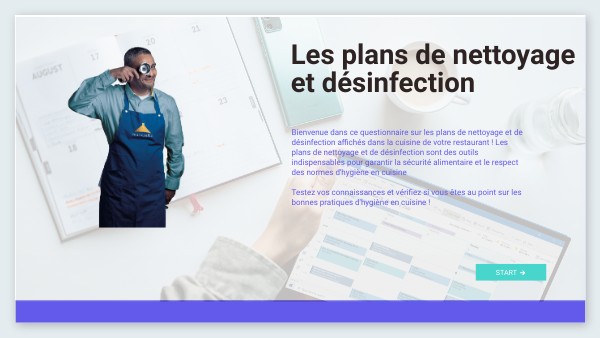 Bienvenue dans ce questionnaire sur les plans de nettoyage et de désinfection affichés dans la cuisine de votre restaurant ! Les plans de nettoyage et de désinfection sont des outils indispensables pour garantir la sécurité alimentaire et le respect des normes d'hygiène en cuisineTestez vos connaissances et vérifiez si vous êtes au point sur les bonnes pratiques d'hygiène en cuisine !