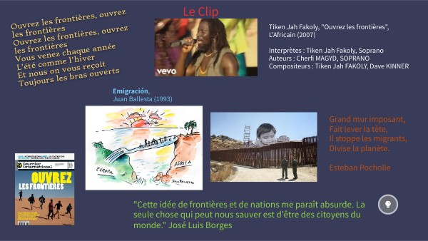 Les paroles de la chanson Ouvrez les frontières de Tiken Jah Fakoly évoquent la migration des Africains et plus précisément leur difficulté à aller en Europe. Ils sont comme emprisonnés dans leur propre pays et n’ont pas accès à la liberté. « Nous voulons voyager et aussi travailler» « Nous aussi on veut connaître la chance d'étudier, « La chance de voir nos rêves se réaliser ».Ces citations montrent qu’ils ne peuvent pas étudier ni travailler. Ils n’ont pas à manger ni à boire « Y a plus une goutte d’eau », « On veut avoir cette vie où l’on mange à sa fin ». De plus, on remarque la répétition de la citation « Ouvrez les frontières » qui montre que les Africains insistent sur leur droit à la liberté. Ils s’adressent aux Européens avec le pronom « Vous » et utilisent « Nous » pour parler des Africains.Le dessin en aquarelle Emigración de Juan Ballesta fait écho à la chanson puisqu’il représente les Africains en train de migrer vers l’Europe, en marchant sur une fourchette au-dessus de la frontière entre l’Europe et l’Afrique. La fourchette signifie que les Africains ont faim et qu’ils veulent passer la frontière pour aller en Europe afin d'avoir de meilleures conditions de vie. Le dessin est également en lien avec le poème Liberté de Maurice Carême qui parle aussi des migrants. On peut constater que plusieurs citations font référence au dessin. Par exemple, « Il est des chemins si aériens » qui représente les Africains sur la fourchette au dessus de la mer, «Regardez, là-bas, l’horizon briller » qui représente le soleil au loin qui projette des couleurs chaudes sur la mer (rouge, orange et jaune).