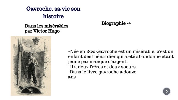 -Né en 1820 Gavroche thénardier appellé aussi "le gamin de paris" ou encore "titi parisien" est un misérable, c'est un enfant des thénardiers qui a été abandonné étant jeune par manque d'argent.