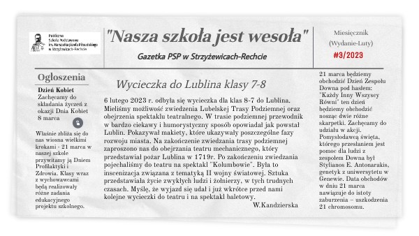 6 lutego 2023 r. odbyła się wycieczka dla klas 8-7 do Lublina. Mieliśmy możliwość zwiedzenia Lubelskej Trasy Podziemnej oraz obejrzenia spektaklu teatralnego. W trasie podziemnej przewodnik w bardzo ciekawy i humorystyczny sposób opowiadał jak powstał Lublin. Pokazywał makiety, które ukazywały poszczególne fazy rozwoju miasta. Na zakończenie zwiedzania trasy podziemnej zaproszono nas do obejrzania teatru mechanicznego, który przedstawiał pożar Lublina w 1719r. Po zakończeniu zwiedzania pojechaliśmy do teatru na spektakl "Kolumbowie". Była to inscenizacja związana z tematyką II wojny światowej. Sztuka przedstawiała życie zwykłych ludzi i żołnierzy, w tych trudnych czasach. Myślę, że wyjazd się udał i już wkrótce przed nami kolejne wycieczki do teatru i na spektakl baletowy. W.