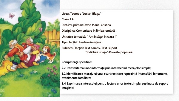 Liceul Teoretic "Lucian Blaga" Clasa: I A Prof.înv. primar: David Maria-Cristina Disciplina: Comunicare în limba română Unitatea tematică: " Am învățat în clasa I" Tipul lecției: Predare-învățare Subiectul lecției: Text narativ. Text suport"Ridichea uriașă"-Poveste popularăCompetențe specifice: 2.2 Transmiterea unor informații prin intermediul mesajelor simple; 3.2 Identificarea mesajului unui scurt rext care reprezintă întâmplări, fenomene, evenimente familiare; 3.4 Exprimarea interesului pentru lectura unor texte simple, susținute de suport imagistic.