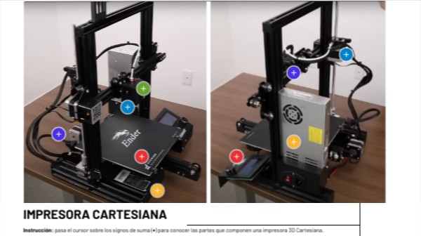 Instrucción: pasa el cursor sobre los signos de suma (+) para conocer las partes que componen una impresora 3D Cartesiana.