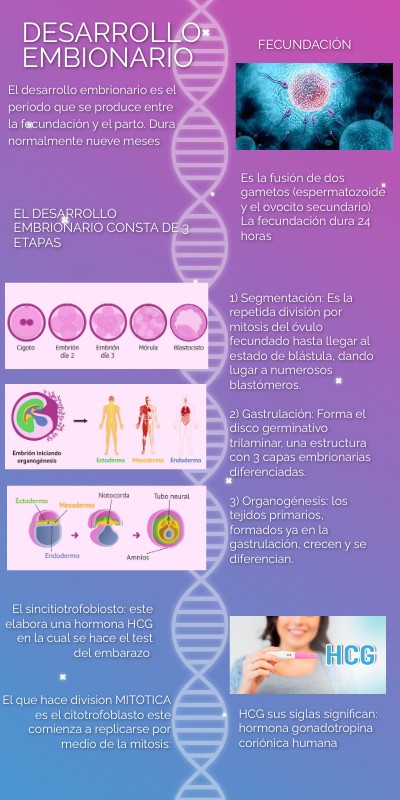 El desarrollo embrionario es el periodo que se produce entre la fecundación y el parto. Dura normalmente nueve meses