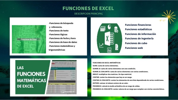 FUNCIONES DE EXCEL MATEMÁTICAS SUMA: suma de varios elementos. SUMAR.SI: suma de varios elementos con una condición. SUMAR.SI.CONJUNTO: suma de varios elementos con varias condiciones. MMULT: multiplicar dos matrices. De tipo matricial. CONTAR: contar los elementos que hay en un rango. CONTAR.SI.CONJUNTO: contar los elementos de una lista dependiendo de varias condiciones. ENTERO: extraer el número entero de un valor. PROMEDIO: calcula la media aritmética de un rango de celdas. PROMEDIO.SI.CONJUNTO: contar valores de un rango que cumplen con ciertas características.