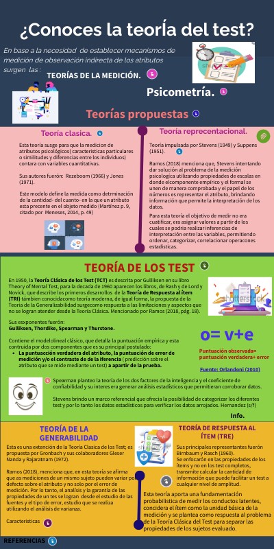 Esta es una extención de la Teoría Clasica de los Test; es propuesta por Gronbach y sus colaboradores Gleser Nanda y Rajaratnam (1972). Ramos (2018), menciona que, en esta teoría se afirma que as mediciones de un mismo sujeto pueden variar por defecto sobre el atributo y no solo por el error de medición. Por lo tanto, el analísis y la garantía de las propiedades de un tes se logran desde el estudio de las fuentes y el tipo de error, estudio que se realiza utilizando el análisis de varianza. Caracteristicas
