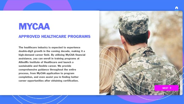 The healthcare industry is expected to experience double-digit growth in the coming decade, making it a high-demand career field. By utilizing MyCAA financial assistance, you can enroll in training programs at AlliedRx Institute of Healthcare and launch a sustainable and flexible career. We provide comprehensive guidance throughout the entire process, from MyCAA application to program completion, and even assist you in finding better career opportunities after obtaining certification.