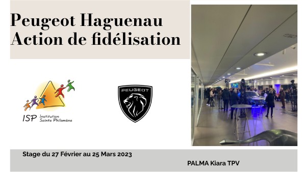 Lancement de la Peugeot 408Objectif : Présentation du nouveau véhicule afin de susciter l'intérêt chez le client Offre : Prix de reprise revu à la hausse si achat de la nouvelle Peugeot 408 lors de l'évenement Cible : Les clients avec une Peugeot 5008,508,3008,308 Enquête de satisfaction