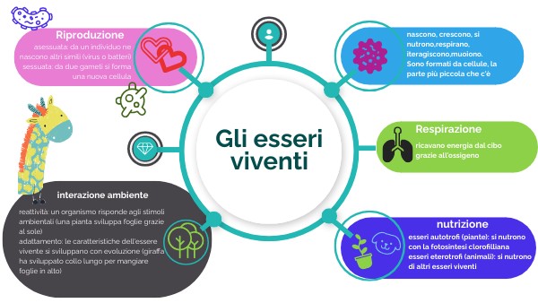 nascono, crescono, si nutrono,respirano, iteragiscono,muoiono.Sono formati da cellule, la parte più piccola che c'è