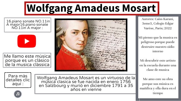 Autores: Caïss Karani, 3eme3, Colegio Edgar Varèse, Paris; 2022 Mì pienso que la musica es peligroso porque puede destruire nuestro oìdio interno Mi descubrir este artisto en la escuela durante una clase de musica Me amo este su obra porque sus mùsica es mañifica y ella dura en el tiempo