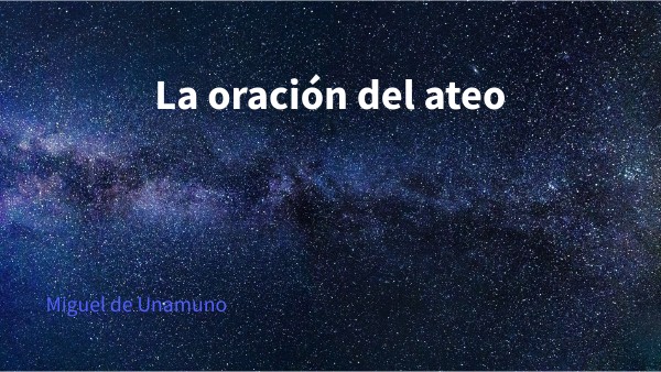 Oye mi ruego Tú, Dios que no existes, y en tu nada recoge estas mis quejas, Tú que a los pobres hombres nunca dejas sin consuelo de engaño. No resistes a nuestro ruego y nuestro anhelo vistes. Cuando Tú de mi mente más te alejas, más recuerdo las plácidas consejas con que mi ama endulzóme noches tristes. ¡Qué grande eres, mi Dios! Eres tan grande que no eres sino Idea; es muy angosta la realidad por mucho que se expande para abarcarte. Sufro yo a tu costa, Dios no existente, pues si Tú existieras existiría yo también de veras.