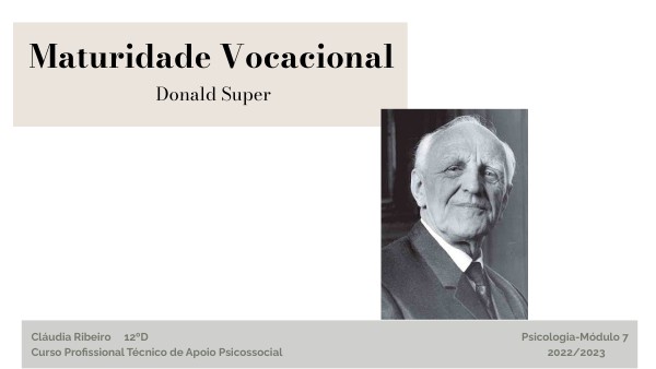 O trabalho presente é sobre maturidade vocacional e desenvolvimento vocacional, mais concretamente escolhas vocacionais - Donald Super Com este trabalho o meu objetivo é conhecer melhor Donald Super e as suas teorias.