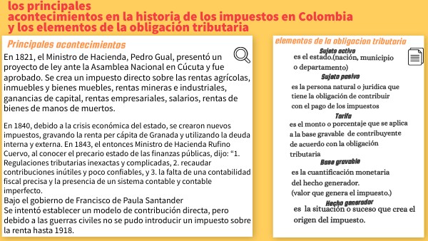los principales acontecimientos en la historia de los impuestos en Colombia y los elementos de la obligación tributaria