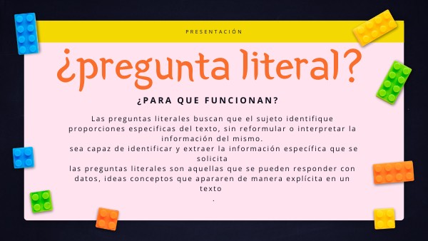 Las preguntas literales buscan que el sujeto identifique proporciones especificas del texto, sin reformular o interpretar la información del mismo. sea capaz de identificar y extraer la información específica que se solicita las preguntas literales son aquellas que se pueden responder con datos, ideas conceptos que apararen de manera explícita en un texto .