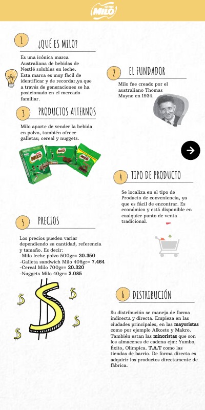 Milo estableció ciertas estructuras basadas en las 4P: Producto, precio, plaza y promoción.-Producto: Innovación, investigación y ejecución sobre la calidad del producto. Variabilidad de opciones para los clientes. -Precio: Utiliza una estretgia de descuentos en cuanto a cantidad, medios de pago, beneficios comerciales. -Plaza y distribución: Ubicación geografica de fábricas que permita la expasión a diferentes territorios. -Promoción: Su estretegia fue ligada con la salud y la energía. Incentiva la participación deportiva