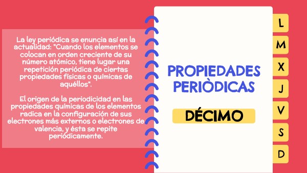 La ley periódica se enuncia así en la actualidad: "Cuando los elementos se colocan en orden creciente de su número atómico, tiene lugar una repetición periódica de ciertas propiedades físicas o químicas de aquéllos". El origen de la periodicidad en las propiedades químicas de los elementos radica en la configuración de sus electrones más externos o electrones de valencia, y ésta se repite periódicamente.