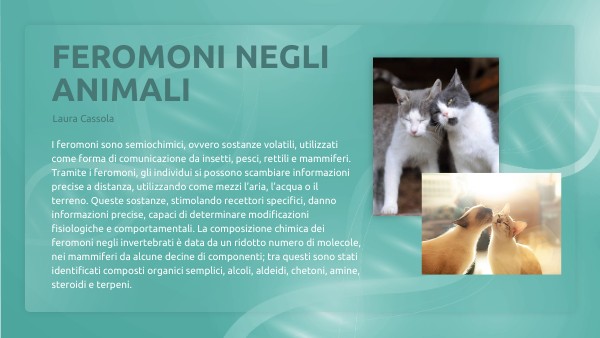 I feromoni sono semiochimici, ovvero sostanze volatili, utilizzati come forma di comunicazione da insetti, pesci, rettili e mammiferi. Tramite i feromoni, gli individui si possono scambiare informazioni precise a distanza, utilizzando come mezzi l’aria, l’acqua o il terreno. Queste sostanze, stimolando recettori specifici, danno informazioni precise, capaci di determinare modificazioni fisiologiche e comportamentali. La composizione chimica dei feromoni negli invertebrati è data da un ridotto numero di molecole, nei mammiferi da alcune decine di componenti; tra questi sono stati identificati composti organici semplici, alcoli, aldeidi, chetoni, amine, steroidi e terpeni.
