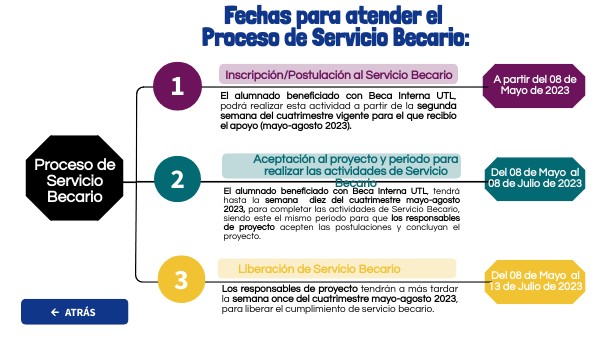 El alumnado beneficiado con Beca Interna UTL, tendrá hasta la semana diez del cuatrimestre mayo-agosto 2023, para completar las actividades de Servicio Becario, siendo este el mismo periodo para que los responsables de proyecto acepten las postulaciones y concluyan el proyecto.