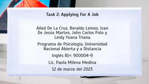 Task 2: Applying For A JobAiled De La Cruz, Beraldo Lemos, Ivan De Jesús Martes, John Carlos Polo y Leidy Yoana Triana Programa de Psicología, Universidad Nacional Abierta y a Distancia Inglés B1+: 900004-9 Lic. Paola Milena Medina 12 de marzo del 2023