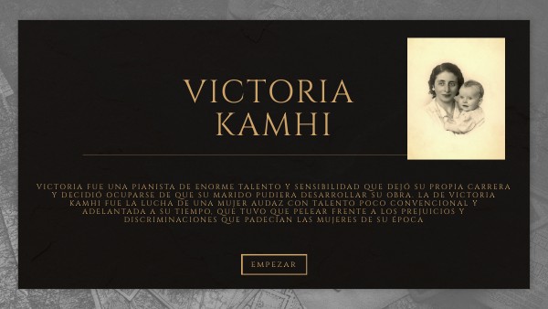 Victoria fue una pianista de enorme talento y sensibilidad que dejó su propia carrera y decidió ocuparse de que su marido pudiera desarrollar su obra. La de Victoria Kamhi fue la lucha de una mujer audaz con talento poco convencional y adelantada a su tiempo, que tuvo que pelear frente a los prejuicios y discriminaciones que padecían las mujeres de su época
