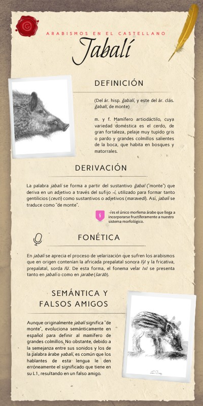 Aunque originalmente jabalí significa “de monte”, evoluciona semánticamente en español para definir al mamífero de grandes colmillos. No obstante, debido a la semejanza entre sus sonidos y los de la palabra árabe yabalí, es común que los hablantes de esta lengua le den erróneamente el significado que tiene en su L1, resultando en un falso amigo.