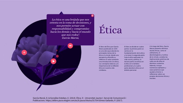García-Marzá, D. & González Esteban, E. (2014). Ética. D - Universitat Jaume I. Servei de Comunicació i Publicacions. https://elibro.puce.elogim.com/es/lc/puce/titulos/51754 Gómez Gallardo, P. (2017).