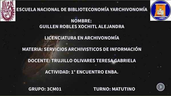 ESCUELA NACIONAL DE BIBLIOTECONOMÍA YARCHIVONOMÍA NOMBRE: GUILLEN ROBLES XOCHITL ALEJANDRA LICENCIATURA EN ARCHIVONOMÍA MATERIA: SERVICIOS ARCHIVISTICOS DE INFORMACIÓN DOCENTE: TRUJILLO OLIVARES TERESA GABRIELA ACTIVIDAD: 1° ENCUENTRO ENBA. GRUPO: 3CM01 TURNO: MATUTINO