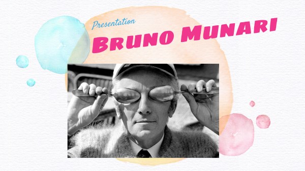 E' nato a Milano. E' stato uno dei massimi protagonisti dell'arte, del design e della grafica: ( pittura, scultura, cinematografia, disegno industriale, grafico). E' stato anche uno scrittore e un poeta. Bruno Munari domina la scena milanese durante gli anni del Boom Economico. Questo è un periodo di grande crescita economica e di sviluppo tecnologico. Inizialmente fa parte della corrente futuristica, poi ha iniziato a inventare la macchina volante e le macchine inutili. Nel 1948 fonda il MAC ( Movimento Arte concreta ) assieme a Gillo Dorfles, Gianni Monnet e Atanasio Soldati. Questo movimento funge da coalizzatore delle istanze astrattiste italiane prospettando una sintesi delle arti, in grado di affiancare alla pittura tradizionale nuovi strumenti di comunicazione ed in grado di dimostrare agli industriali e agli artisti la possibilità di una convergenza tra arte e tecnica.