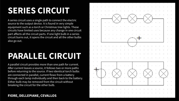 A series circuit uses a single path to connect the electric source to the output device. It is found in very simple equipment such as a torch or Christmas tree lights. These circuits have limited uses because any change in one circuit part affects all the circuit parts. If one light bulb in a series circuit burns out, it opens the circuit and all the other bulbs also go out.