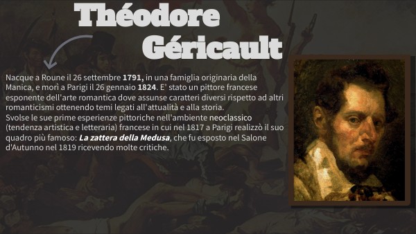 Questo quadro era stato rifiutato dai parigini perchè dicevano che era sconvolgente : superstiti di un naufragio della Medusa in cui si vede la Francia che piange i suoi morti ma con all'orizzonte speranza di rinascita. Géricault rappresenta il naufragio, cannibalismo la salvezza o morte e la scena in cui i sopravissuti sollevano un giovane nero che sventola uno straccio colorato per essere più visibile e i corpi morti. Studiò anatomia per poter rappresentare al meglio ogni dettaglio del quadro. La scelta dei colori scuri servono ad accentuare la tragedia e le parti più chiare per rappresentare la speranza.