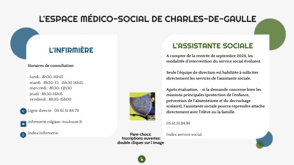 A compter de la rentrée de septembre 2025, les modalités d'intervention du service social évoluent. Seule l'équipe de direction est habilitée à solliciter directement les services de l'assistante sociale. Après évaluation, - si la demande concerne bien les missions principales (protection de l'enfance, prévention de l'absenteisme et du decrochage scolaire), l'assistante sociale pourra reprendre attache directement avec l'élève ou la famille. 05.61.51.84.84 Index service social